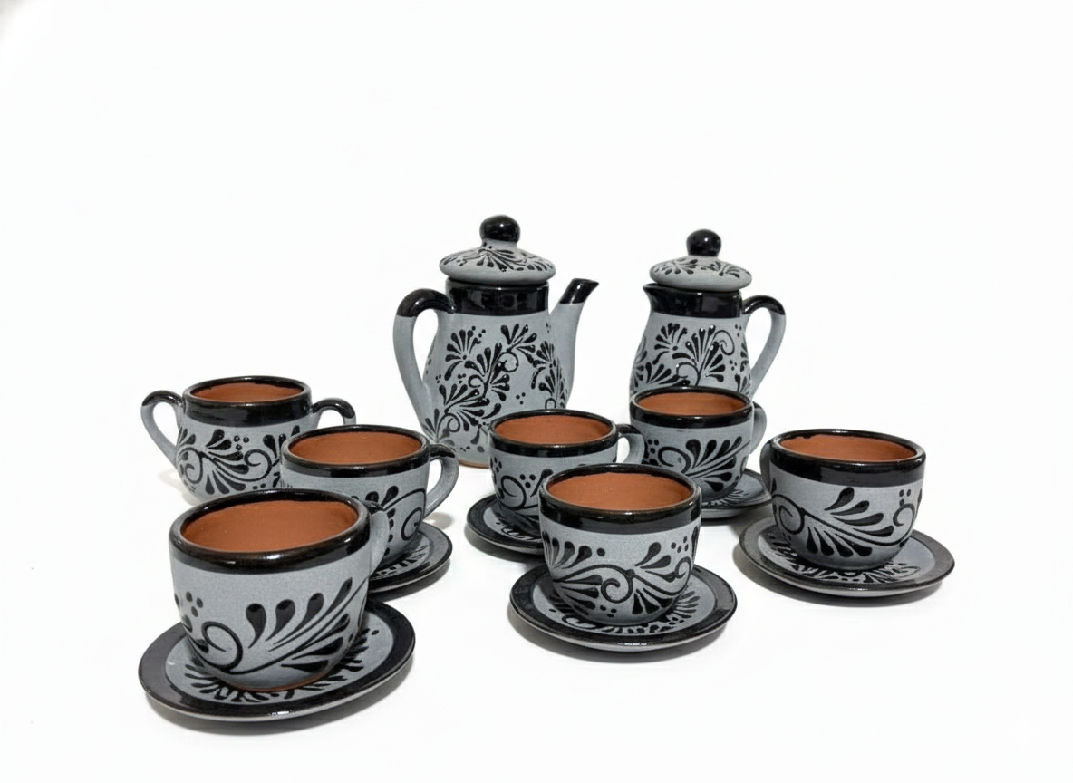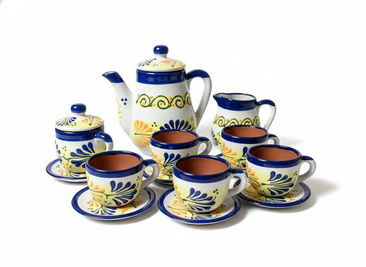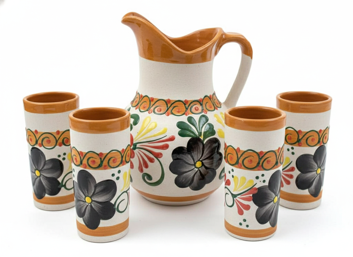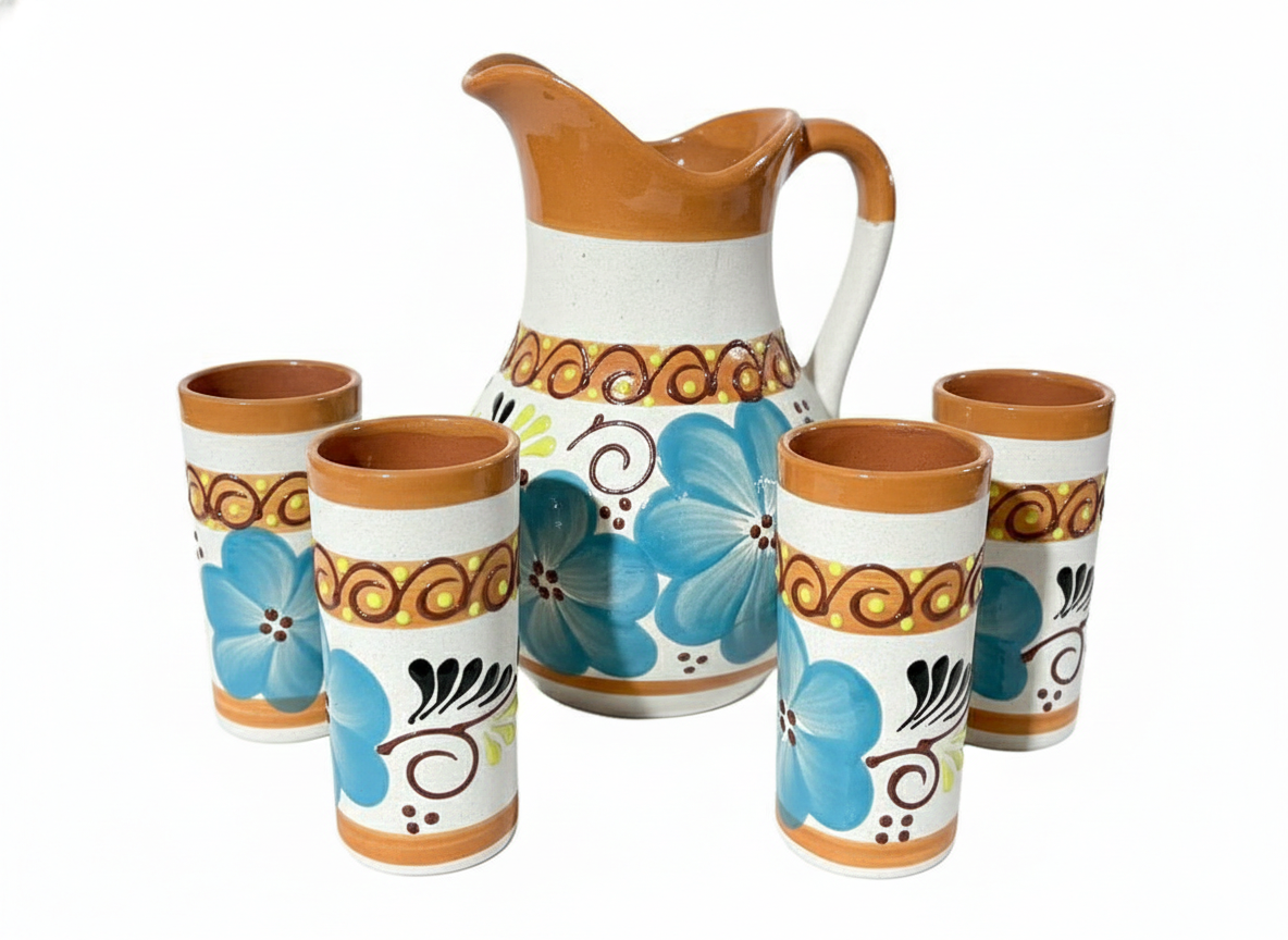 This collection includes cups, plates, pitchers, teapots, and serving pieces, all painted with hand-applied patterns inspired by floral, geometric, and organic forms. The natural warmth of terracotta is balanced with carefully applied glazes and bold yet refined color accents, creating pieces that feel both authentic and modern.