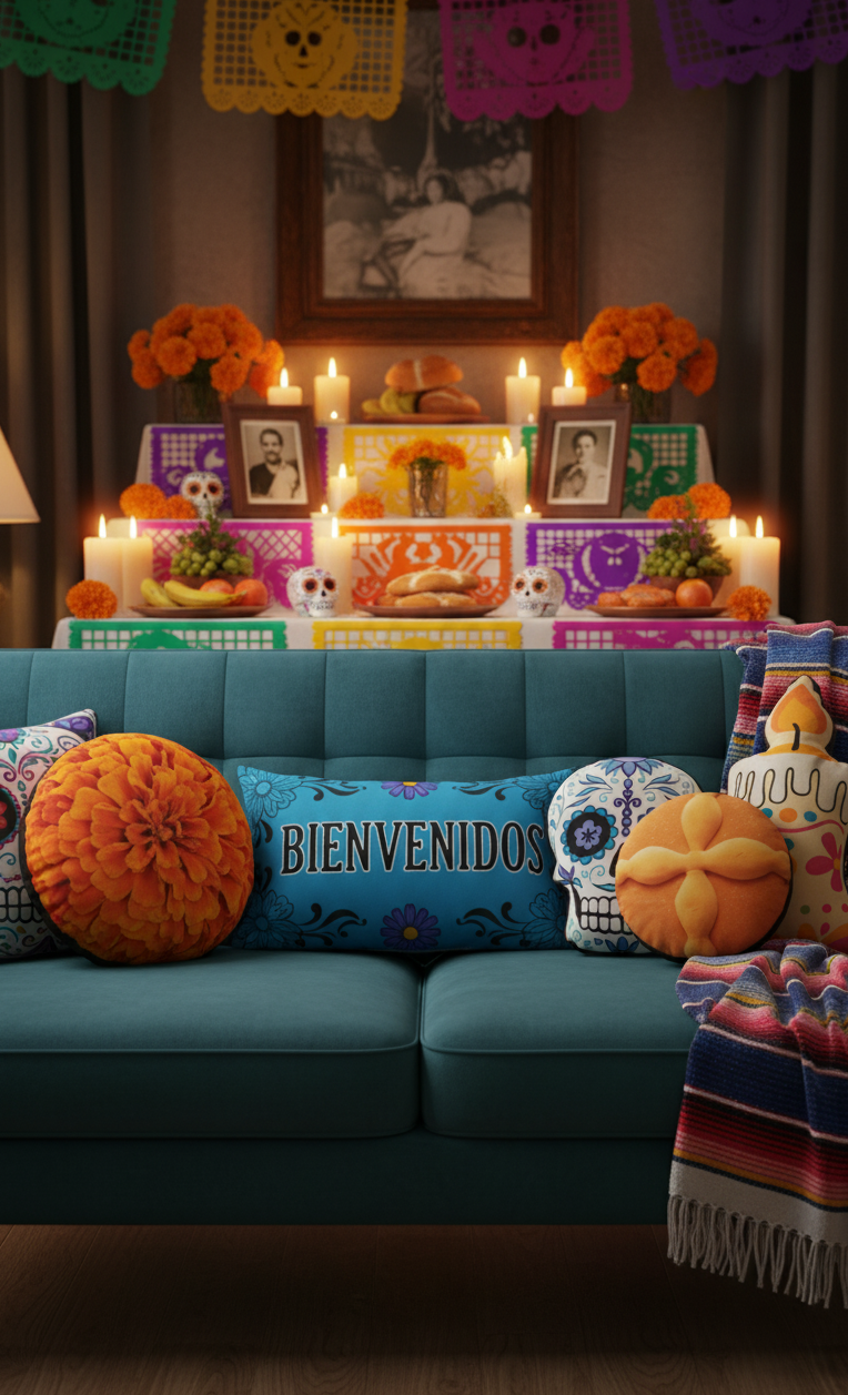Each design pays homage to an important element of this beloved tradition — the sugar skull, the marigold flower, the Pan de Muerto, the candle, and the welcome papel picado — blending culture, comfort, and artistry in every stitch.