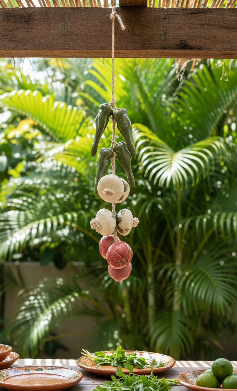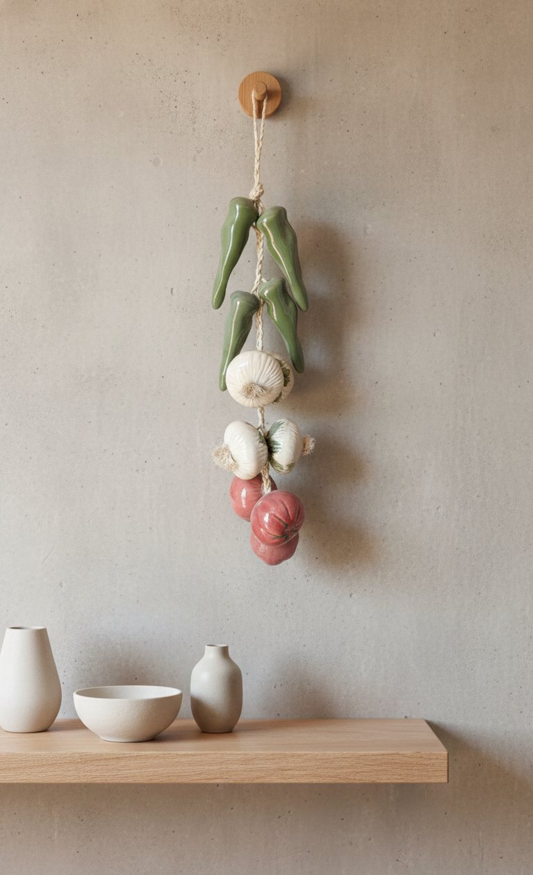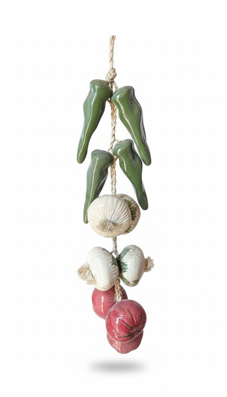 This piece features a traditional hanging string of vegetables, including chili peppers, garlic bulbs, and onions, all carefully molded from clay and finished with hand-painted details that highlight their natural textures and colors. The vegetables are assembled using a natural fiber rope, reinforcing its rustic and authentic character.